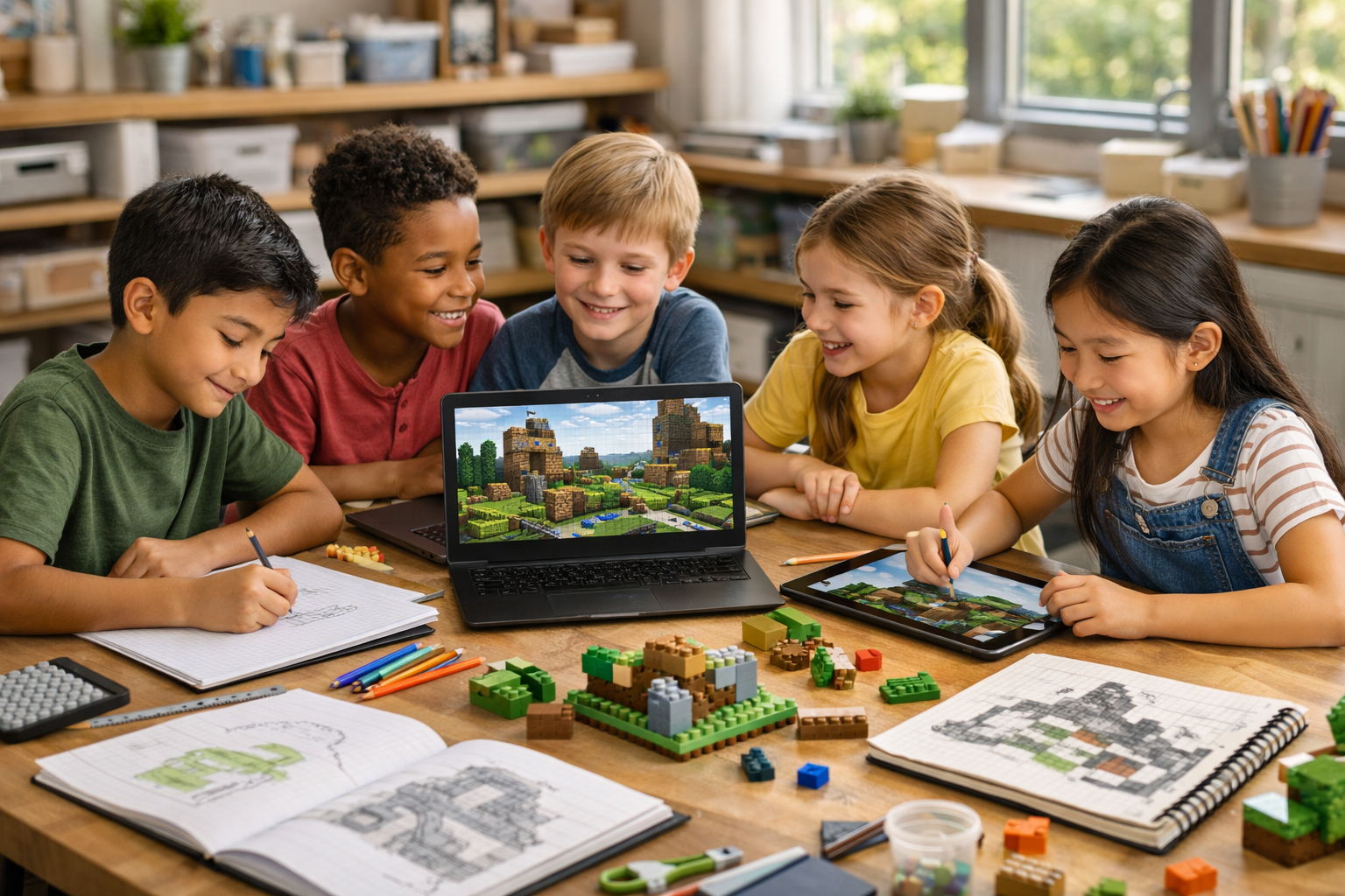 Students collaborate on guided Minecraft challenges that encourage creativity, critical thinking, teamwork, and STEM skills. Each session blends digital building with real-world maker activities, such as planning builds on paper, designing structures, and solving engineering challenges inspired by the Minecraft universe.